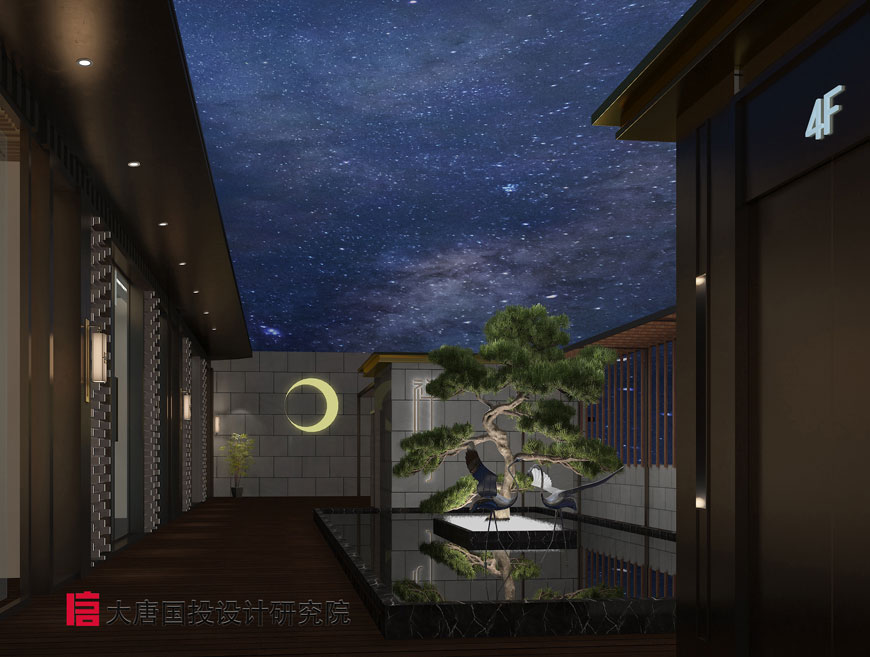 進(jìn)入門廳區(qū)域,映入眼簾的是一副仙鶴水戲圖,看著他們在水中浮沉游戲,仿佛時間靜止,物我兩忘。旁邊旋轉(zhuǎn)而上的青銅質(zhì)感的迎客松,是整個空間一大亮點。兩側(cè)是吧臺與卡座分廳而立。水景屏風(fēng)后方是通透簡明的明檔,模糊了明檔與公共區(qū)域的邊界。